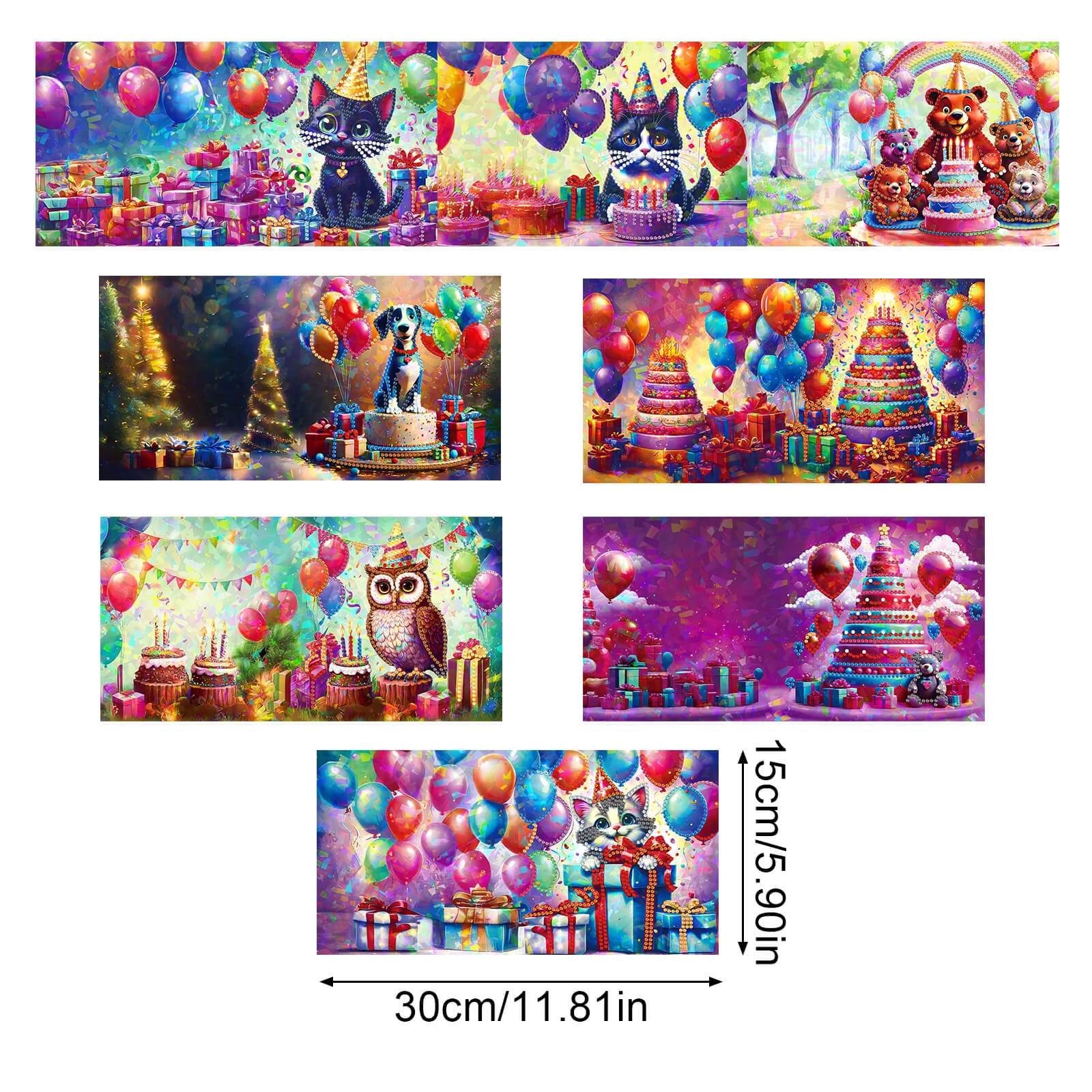 ✔️ 8 unieke verjaardagskaarten (30x15 cm) – Dieren, ballonnen, cadeautjes en taart in verschillende designs