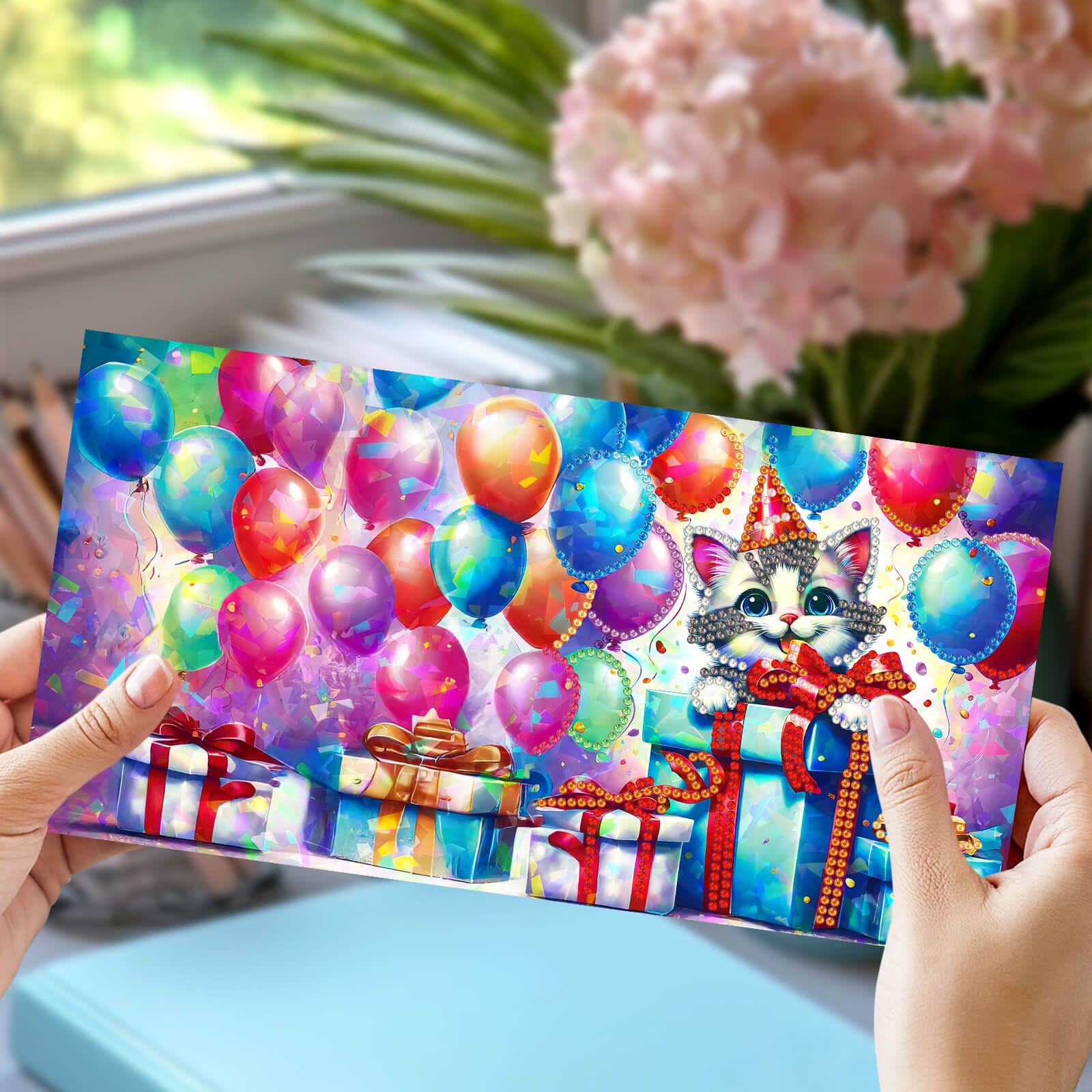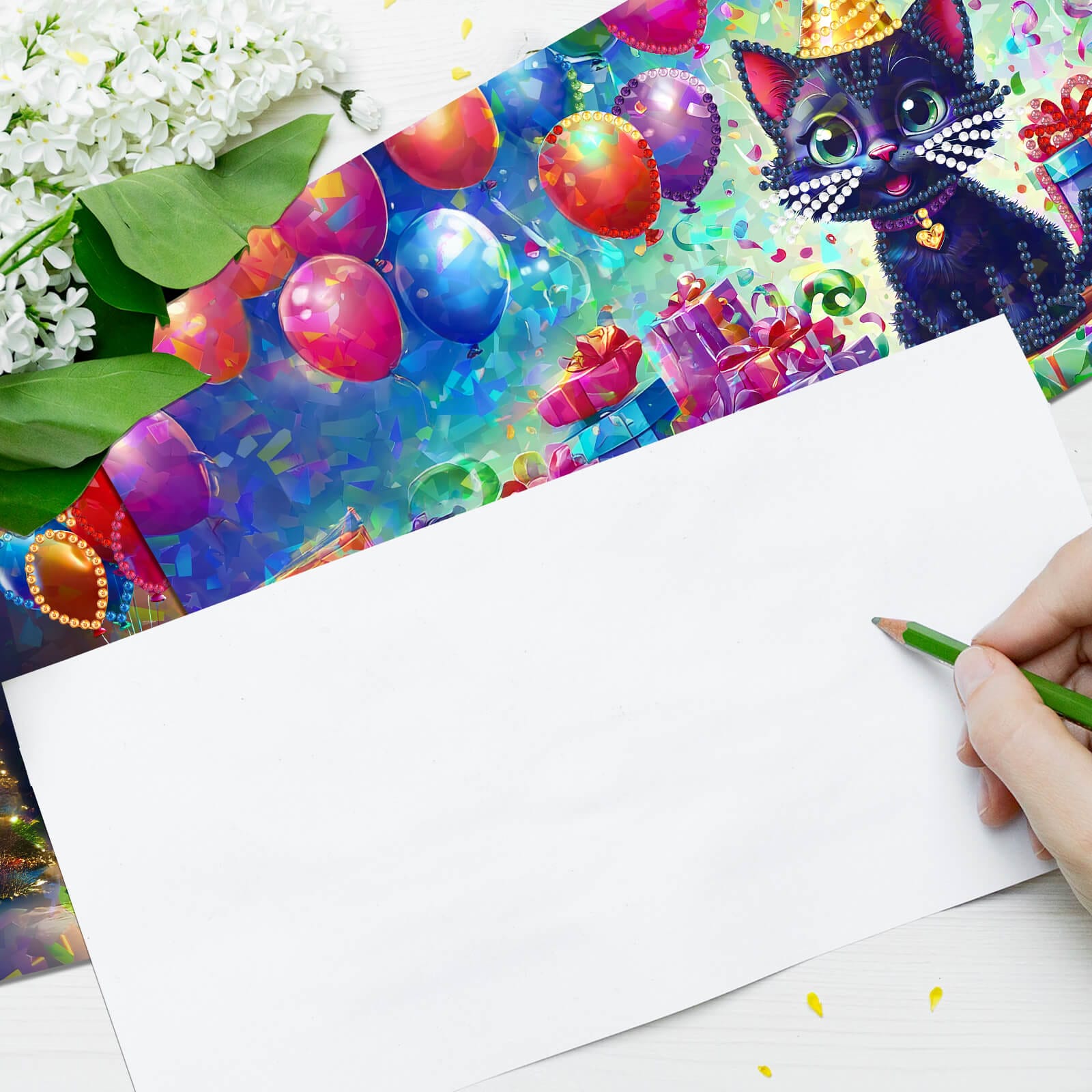 Wil je Diamond Painting verjaardagskaarten maken die echt opvallen? Met deze Diamond Painting set maak je 8 feestelijke verjaardagskaarten met schattige dieren, ballonnen, cadeautjes en taarten. Door het langwerpige formaat (30x15 cm) hebben de verjaardagskaarten extra veel ruimte voor detail. De parelmoer glinstering en het lichtreflecterend effect geven elke kaart een luxe, vrolijke uitstraling. Heerlijk om te maken én superleuk om te geven.