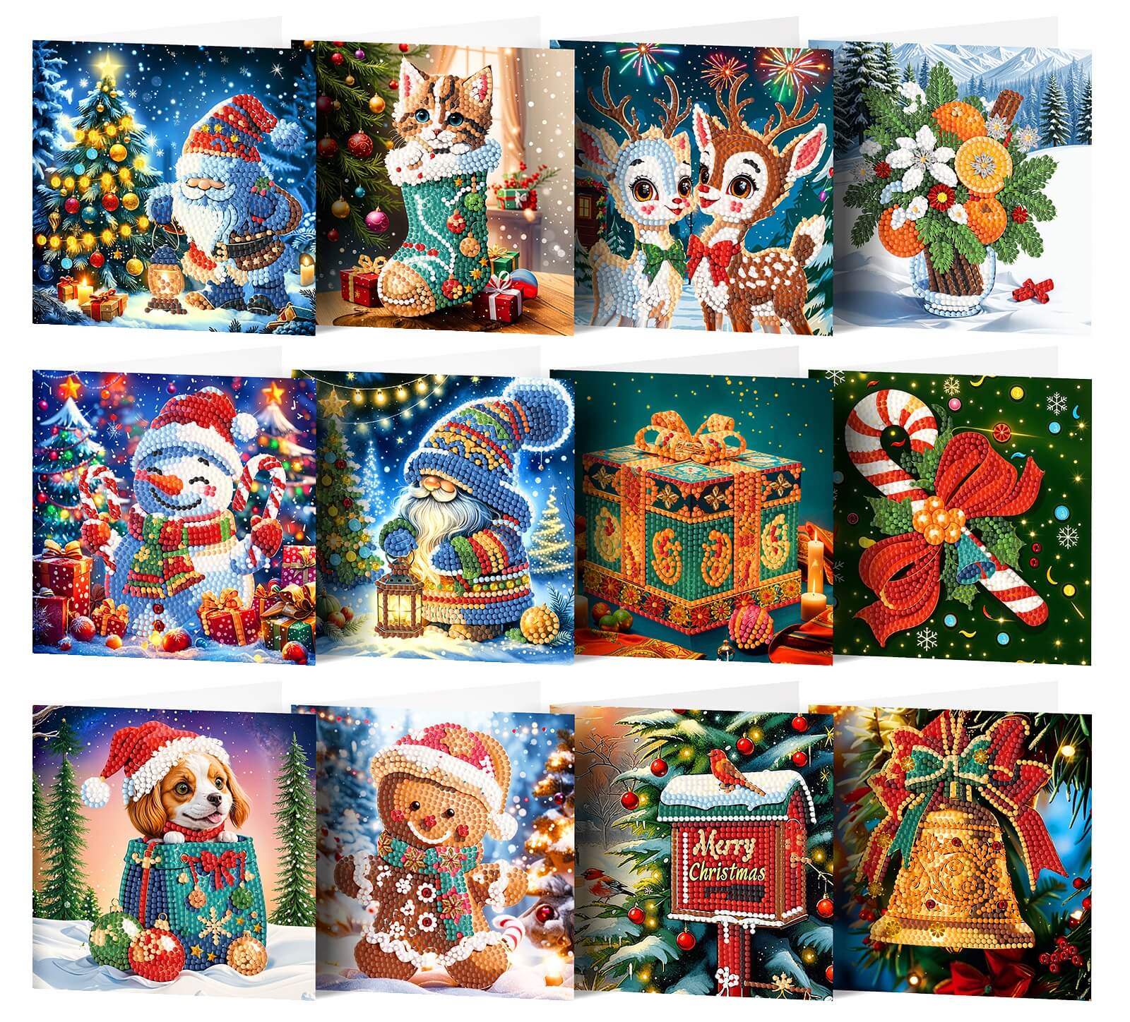 ✓ 12 Diamond Painting kerstkaarten (15x15 cm) - Met diverse ontwerpen zoals een kerstman, rendieren, kat in een kerstsok, sneeuwpop, hond met kersthoed, gingerbread mannetje, en een feestelijk kerstboeket.